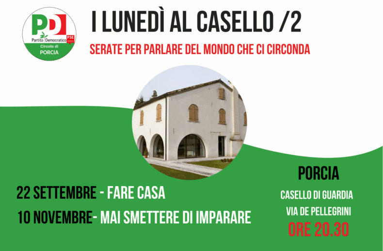 Il Circolo del Partito Democratico di Porcia rilancia la rassegna “I Lunedì al Casello” della scorsa primavera, un ciclo di incontri pubblici di approfondimento su temi concreti che toccano la vita dei cittadini.…