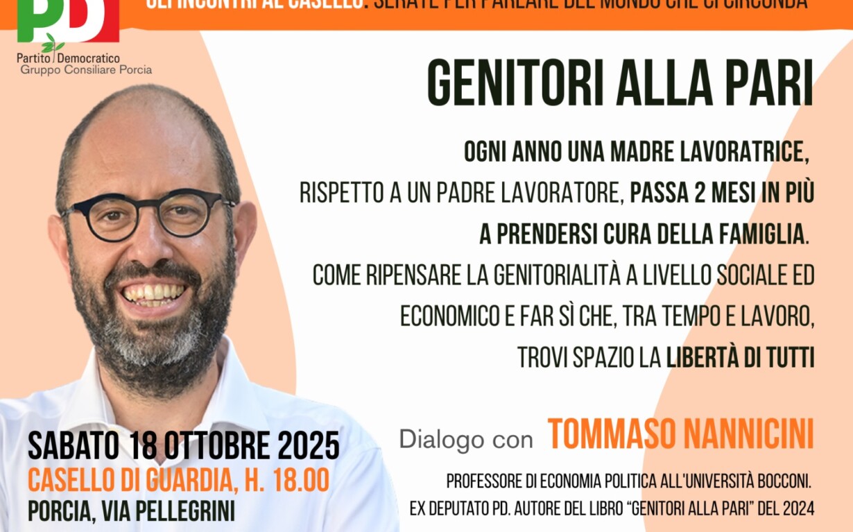 Il Partito Democratico di Porcia invita la cittadinanza all’incontro pubblico “Genitori alla pari” con Tommaso Nannicini, economista e autore del libro omonimo, in programma sabato 18 ottobre alle ore 18 presso il Casello di Guardia in via de Pellegrini, a Porcia.